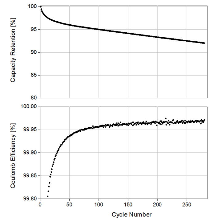 In the first diagram, we look at capacity retention and Coulomb efficiency over time. Even after 5000 hours of measurement, the observed capacity loss is only 10%. This high value is comparable to commercial lithium-ion batteries. Battery longevity is achieved by the high tightness of the PAT-Cell, specifically through the use of a metallic aluminum seal.