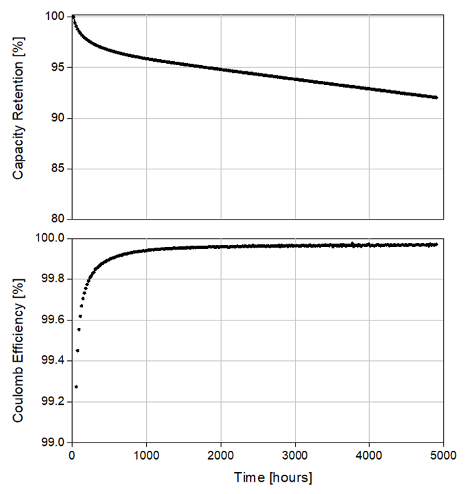 The result: long-term experiments with performance retention comparable to commercial lithium-ion batteries — as you can see in these test results, only 10% capacity loss over more than 5000 hours.