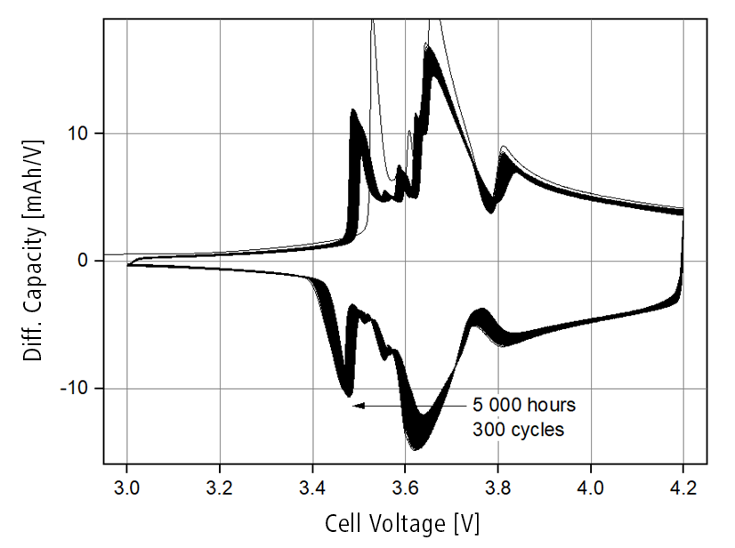 The last two diagrams show that the reference electrode functions without any problems throughout the entire period, allowing us to examine the performance of the anode and cathode separately. This is a significant advantage over conventional two-electrode measurements, e.g., coin-cell measurements.