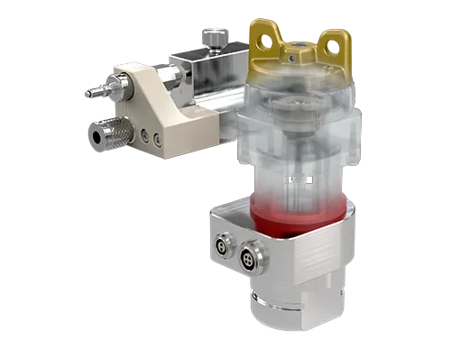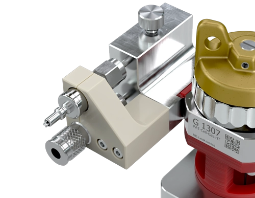 The reaction gases generated are channeled from the cell base to the carrier gas system and mixed via a bypass/Laval nozzle. This setup ensures that the carrier gas does not come into contact with the cell stack, thereby preventing the cells from drying out. The carrier gas system connects to the cell using Swagelok quick-connect fittings.
