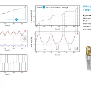 This test cell is equipped with advanced digital pressure and temperature sensors that transmit data via a reliable I²C interface to the EL-Software, allowing for real-time data plotting. The PAT-Cell-Press II S variant also features a septum connection for drawing gas samples for further analysis. Its wireless connection to the potentiostat reduces interference signal and minimizes setup time.